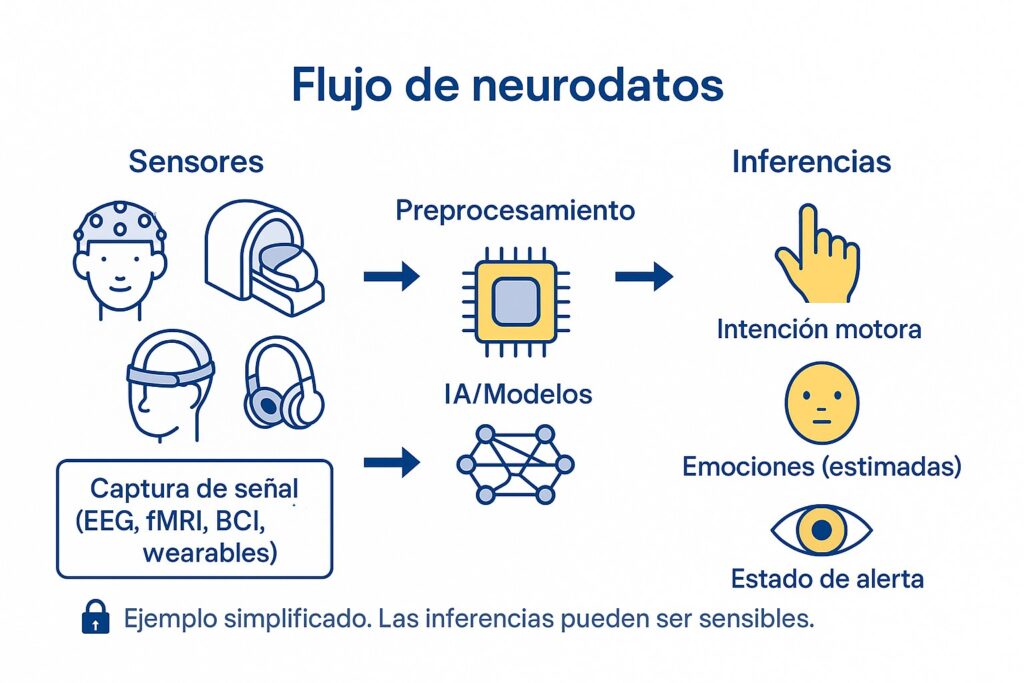 Llamamos neurodatos a señales cerebrales (por ejemplo, EEG o fMRI) y a métricas inferidas con IA (intención motora, estimaciones emocionales). Al combinarse con otras huellas digitales, amplifican lo que puede saberse de una persona.
